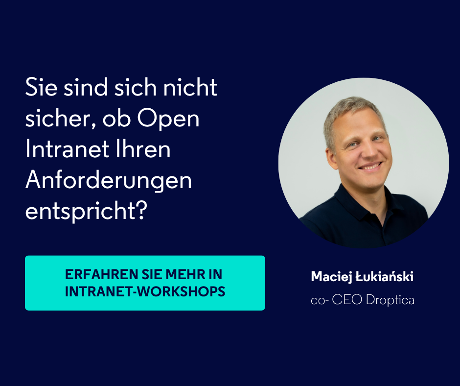 Wenn Sie kein IT-Team haben oder es mit anderen Aufgaben ausgelastet ist, kann Droptica die Wartung und Weiterentwicklung Ihres auf Open Intranet basierenden Systems übernehmen.