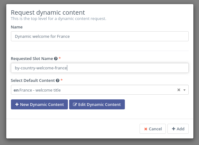 For this lets again create a Dynamic Content element with filters. We only want to target users for whom we have the Country information. In the Filters tab, we chose Country not empty. Our dynamic content will only display if we have the data.