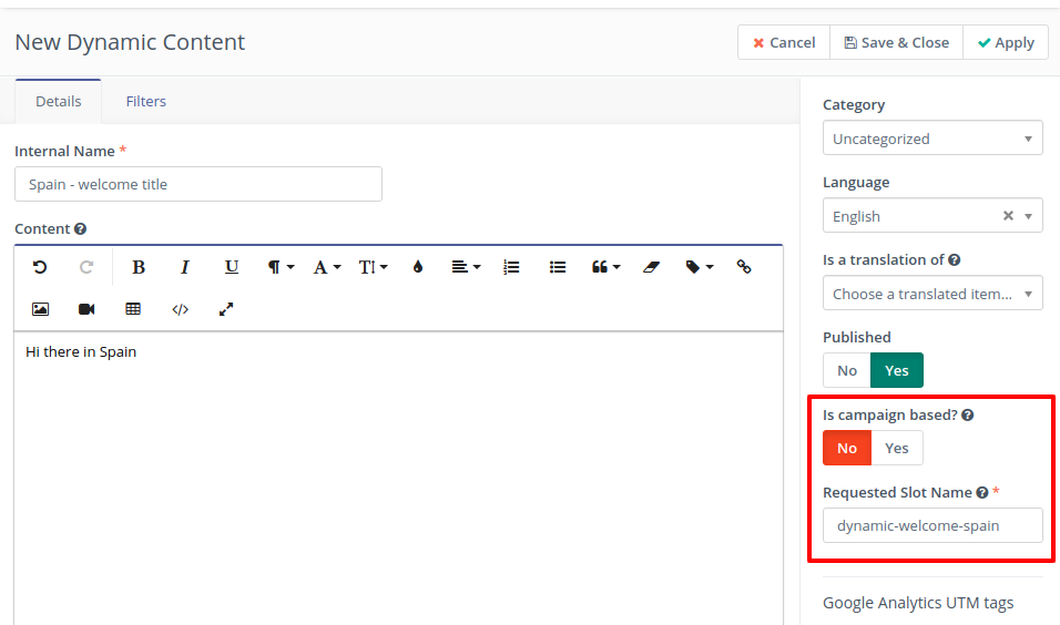 To create a Dynamic Content element, which will be used in a campaign, we follow the same steps as above but leave the "Is campaign based" toggle set to Yes.
