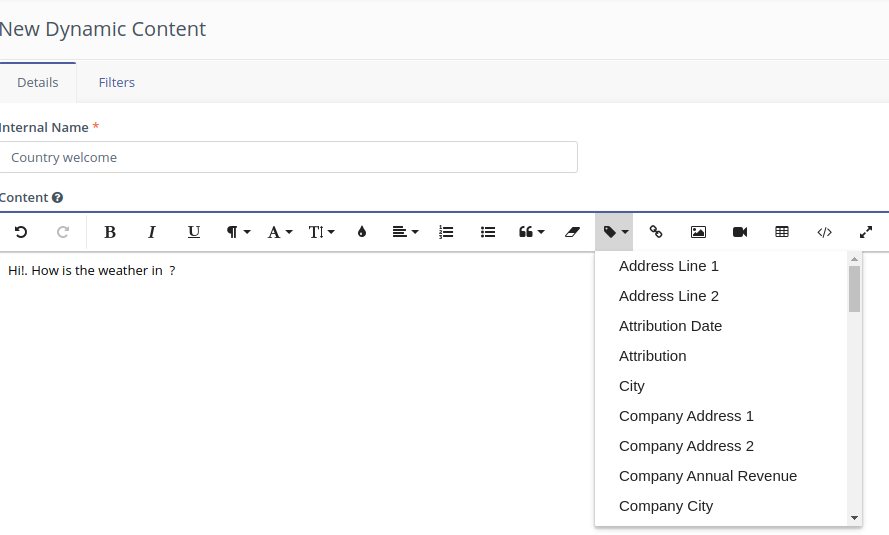 In the content let's add the text using a token which will pull the data from the particular contact which is currently visiting the website. It is easy to browse tokens using a dropdown. You can also start typing after a parenthesis { and Mautic will suggest tokens.