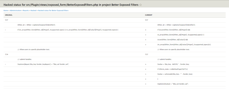 We recommend installing the Diff module, which allows one to clearly track the changes between the current version of the file and the one downloaded by the Hacked! module.