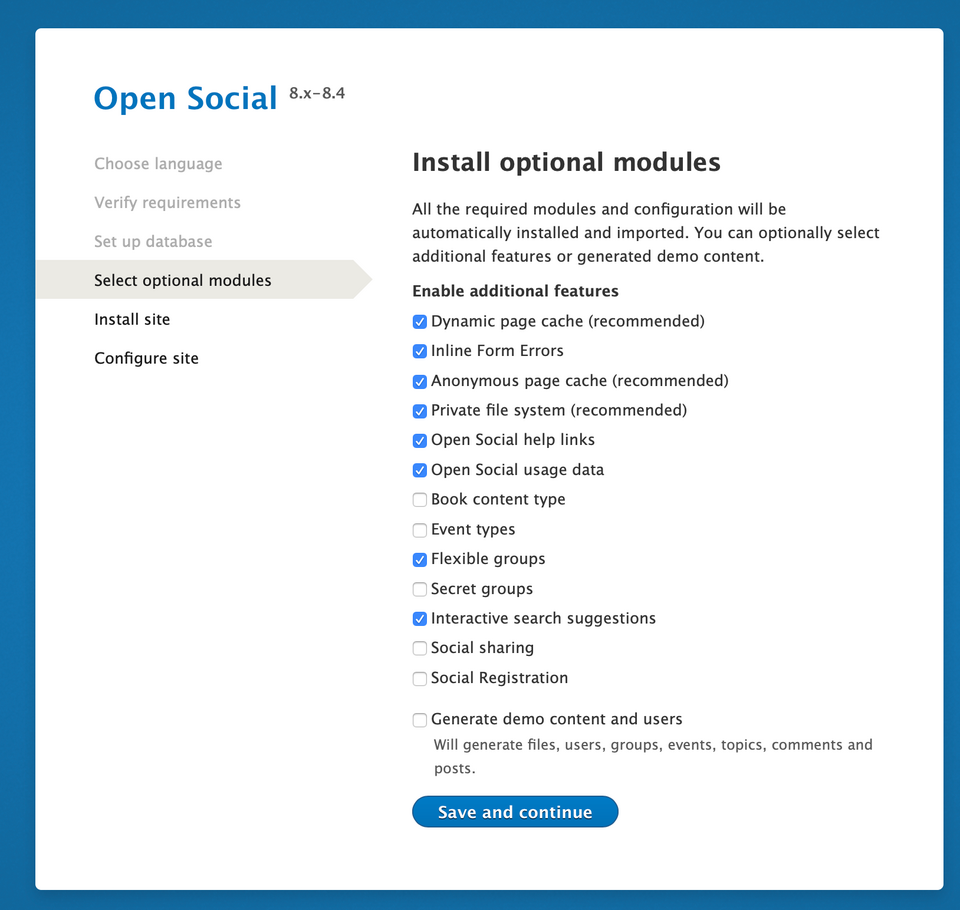 In Open Social ®, during installation, you have additional options in the form of functionalities that can be turned on. There are a dozen or so of them, some are checked by default on the configuration form. Everyone can decide for themselves what to install.