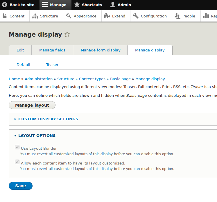 Da Layout Builder nur in Entitäten verwendet werden kann, finden Sie sofort nach der Installation eine Option, dieses Modul anstelle des Standard-Anzeigenmanagers im Tab Anzeige verwalten bei allen Entitätstypen zu verwenden.